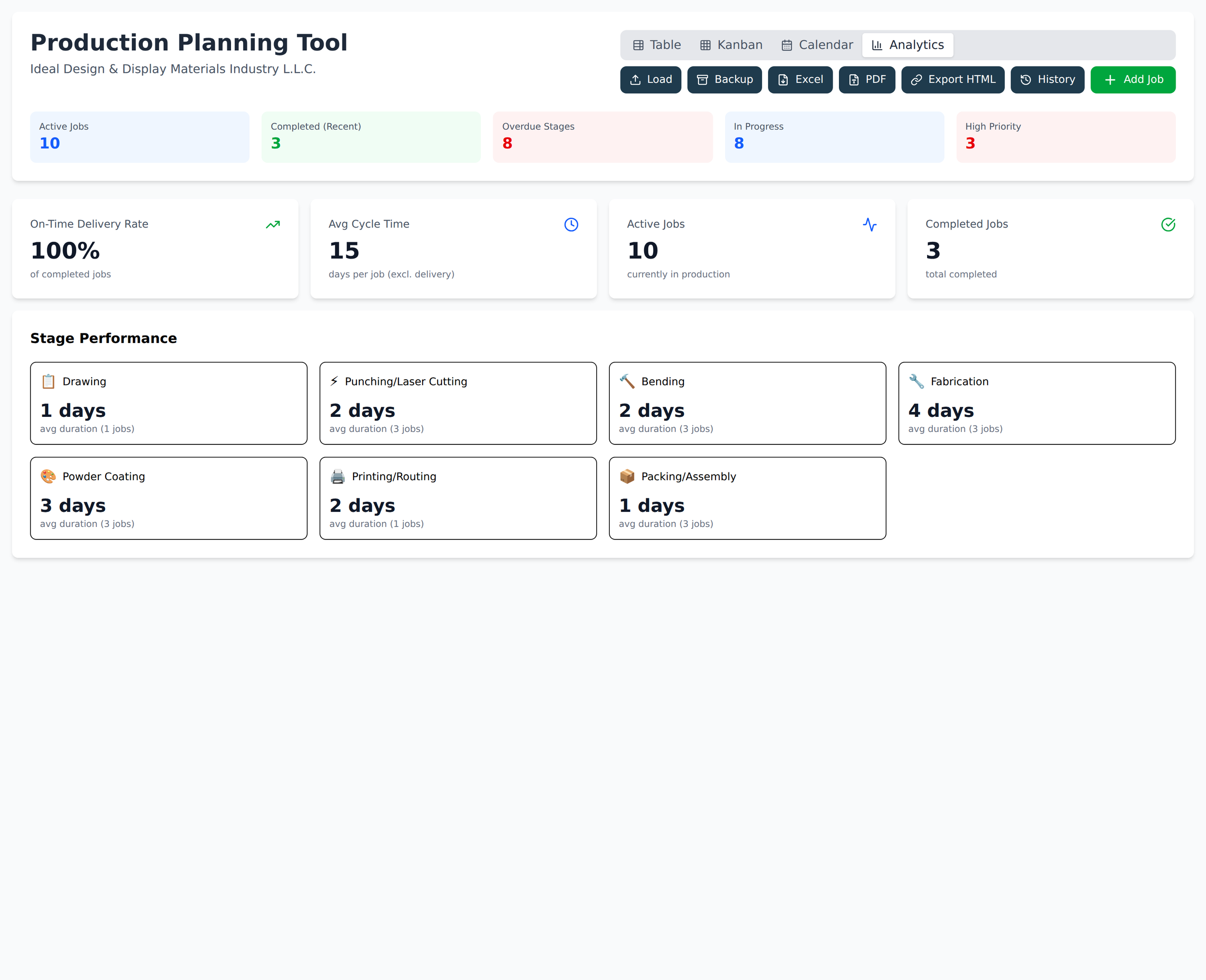 What makes this more than just a digital whiteboard is the analytics layer sitting underneath. Every job logged and every stage transition recorded feeds into a growing dataset. The dashboard calculates on-time delivery rates, average cycle times per job, and active versus completed workloads automatically. It also flags bottlenecks in real time, so if jobs are piling up at powder coating or bending is falling behind, supervisors can act before delays cascade downstream. Over time, as more data accumulates, the stage performance metrics become genuinely useful for capacity planning and spotting recurring constraints.